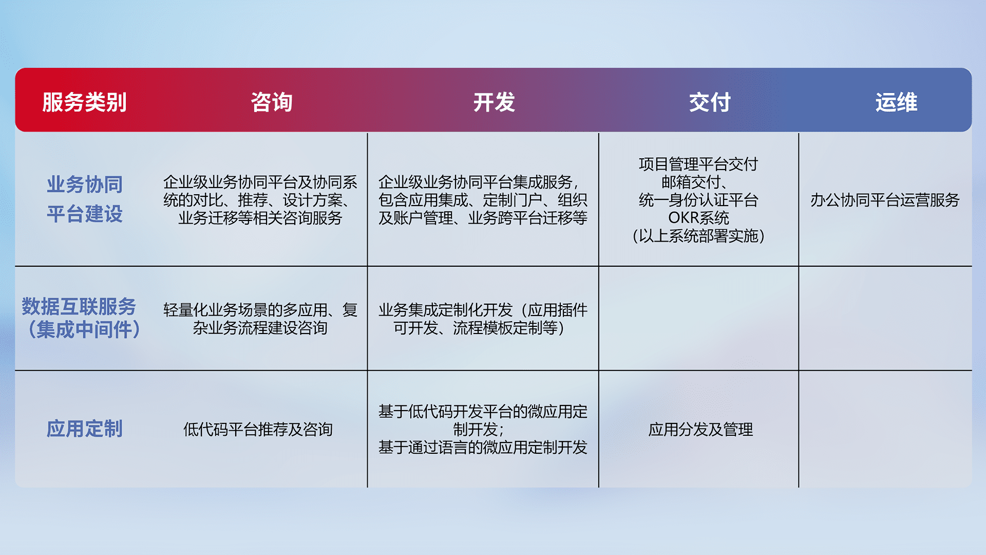 针对钉钉、、、、企微、、、、IDaas等平台级产品提供产品的规划、、、、方案、、、、交付、、定制化开发等服务,,实现如统一协同办公、、、、智能客户服务、、、混合会议管理、、智能数据查询、、等业务场景,,实现数字化转型。。。。